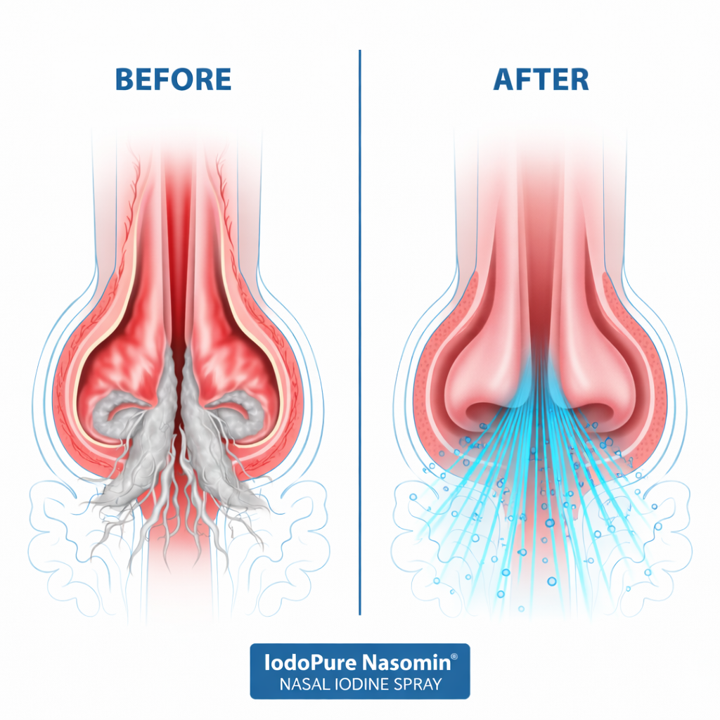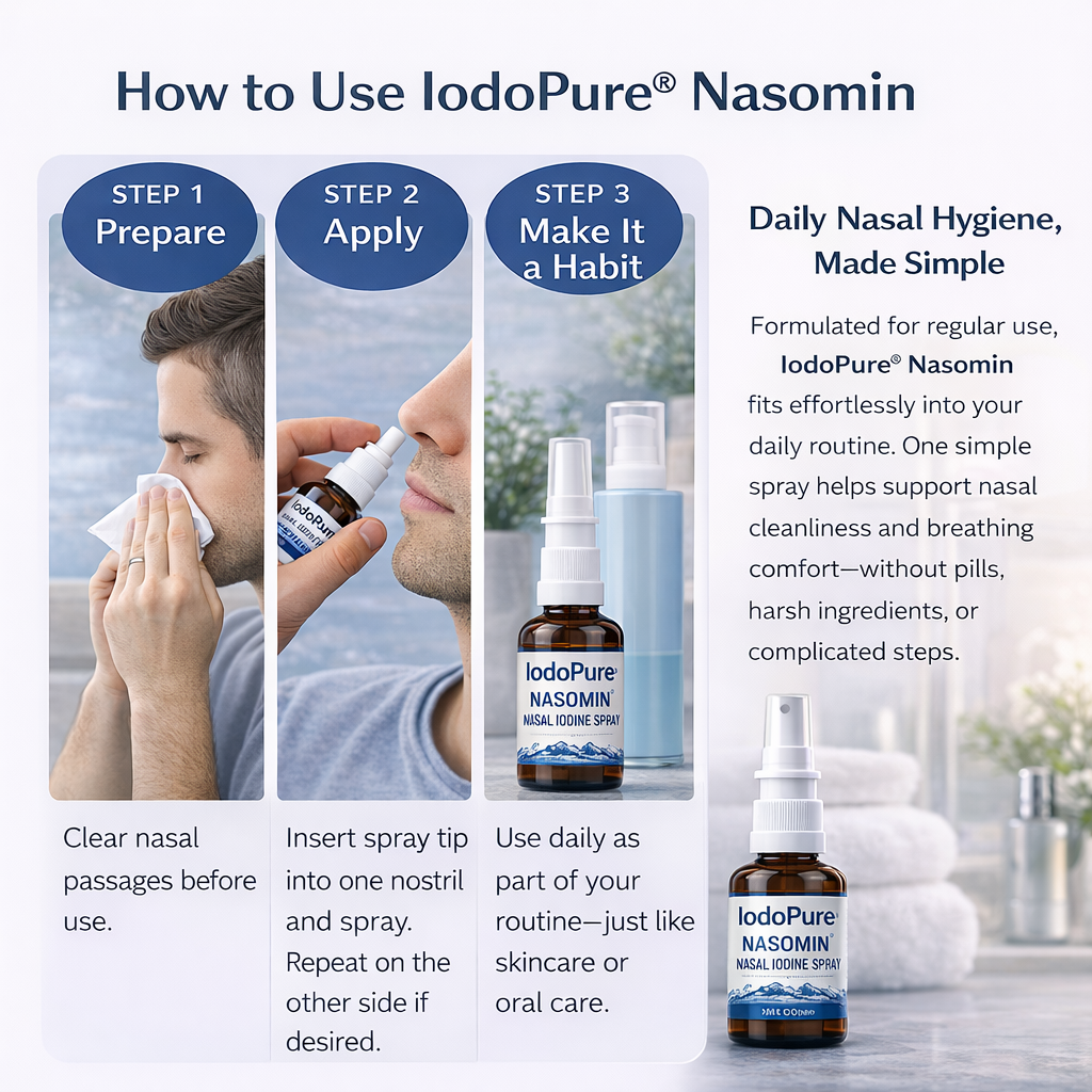 Daily exposure to shared environments and airborne virus particles makes nasal hygiene an important part of routine personal care. IodoPure is designed to support regular nasal cleansing by helping maintain clean, comfortable nasal passages. Used as part of a consistent daily hygiene routine, a few controlled sprays provide targeted nasal care similar to other essential personal hygiene practices.